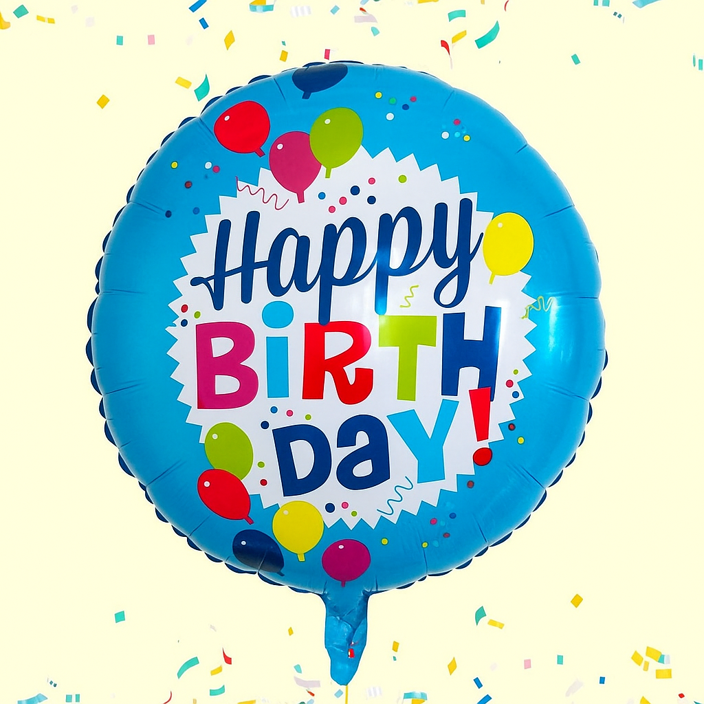 Een blauwe helium ballon met de tekst Happy Birth Day!