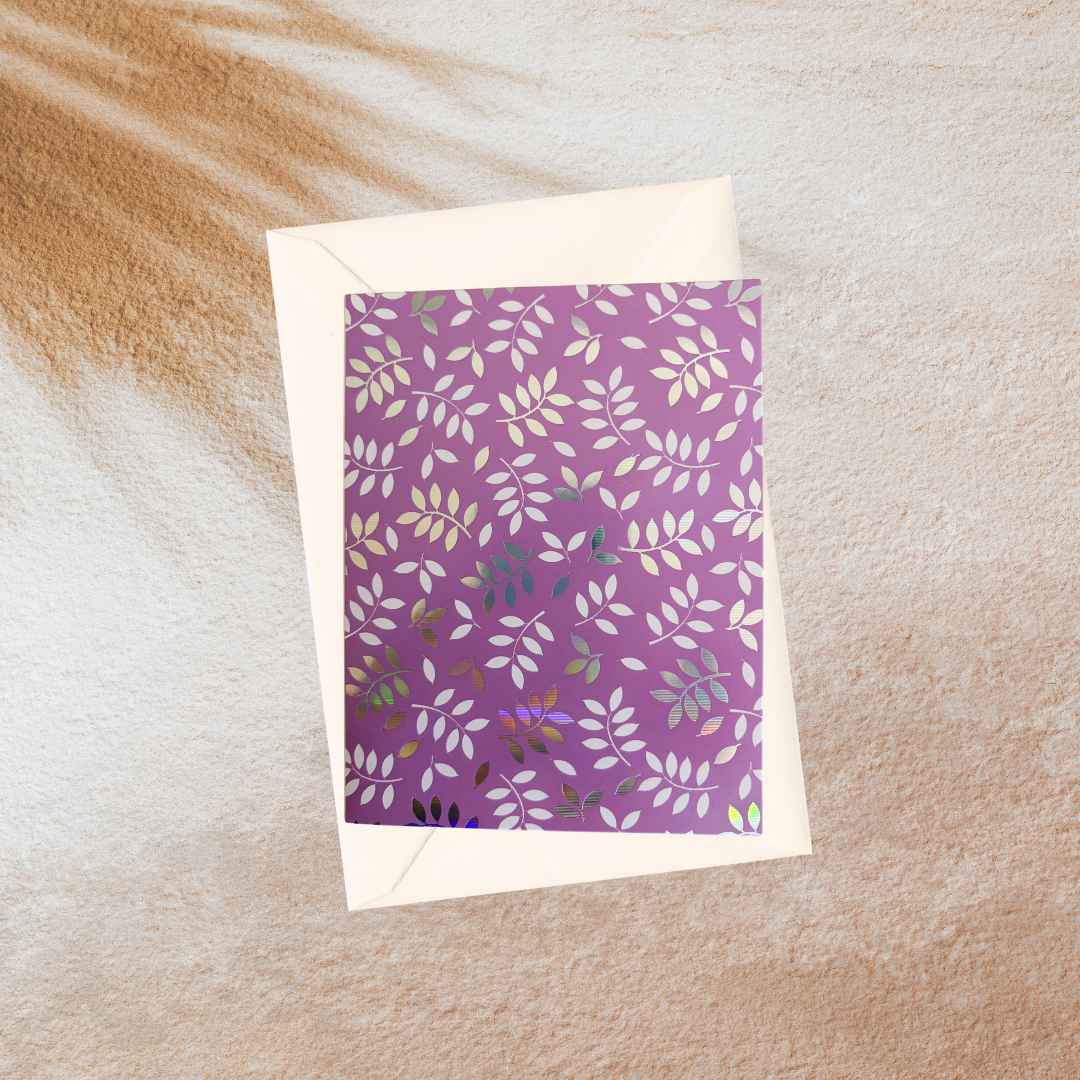 Een paarse kaart met wit en zilver kleurige bladeren